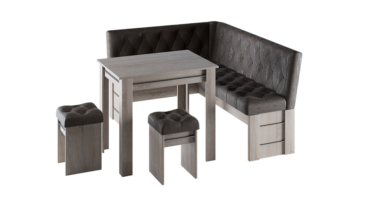 • Обеденная зона "Памела" состоит из удобной угловой скамьи, практичного стола и компактных табуретов.