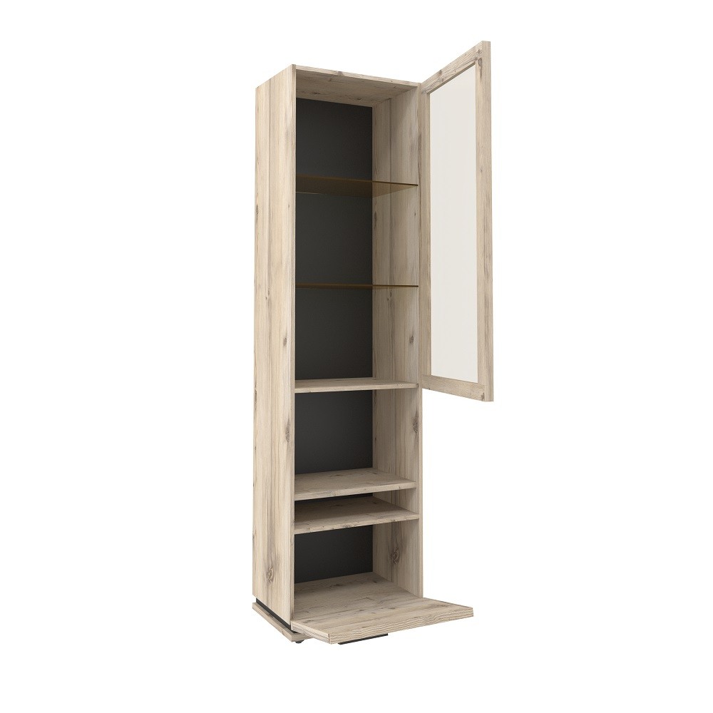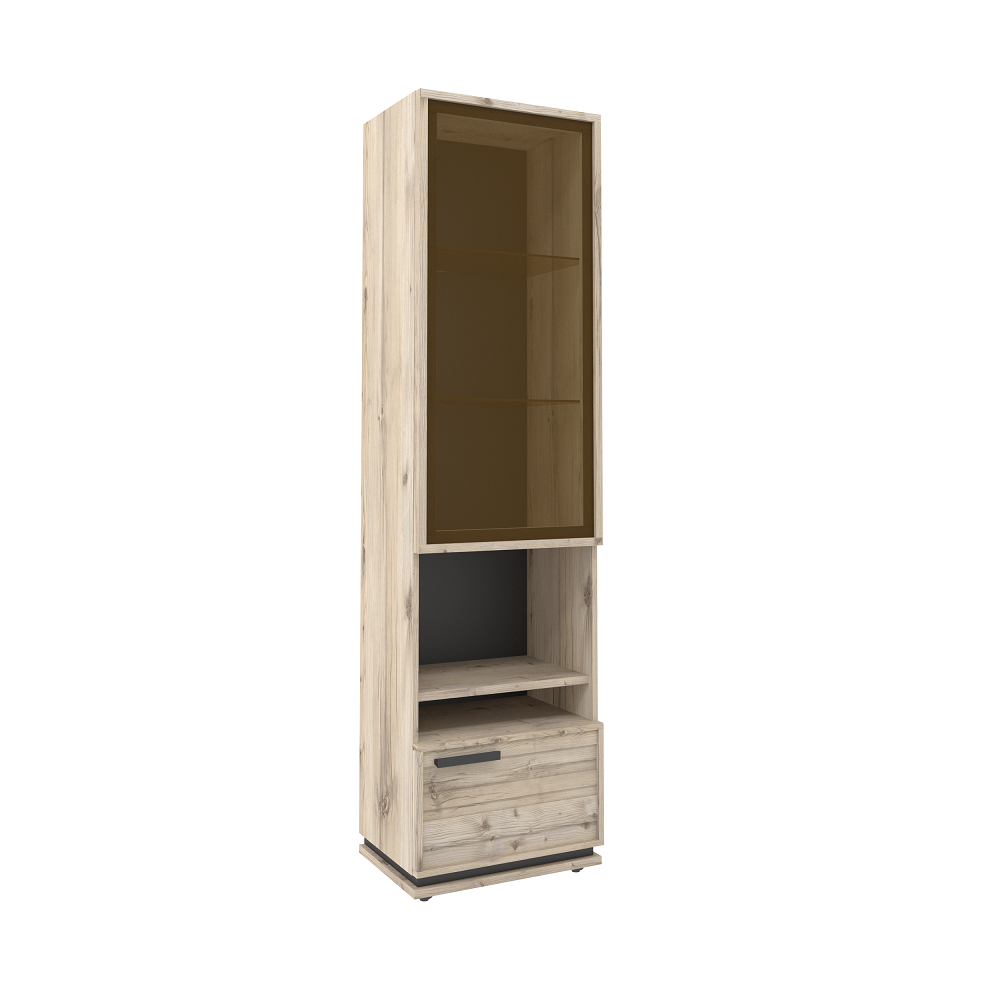 Дополнит легкую компоновку для гостиной и украсит комнату. Такая витрина не только позволяет показать гостям красивую посуду, но и сама является украшением интерьера. Особенности: трендовый дизайн геометричные трапециевидные ручки из массива невидимые подвески полок кромка 2 мм по периметру сборных фасадов как гарантия долговечности изделий полки, регулируемые по высоте универсальная сборка витрина открывается за боковой свес ручки из массива березы