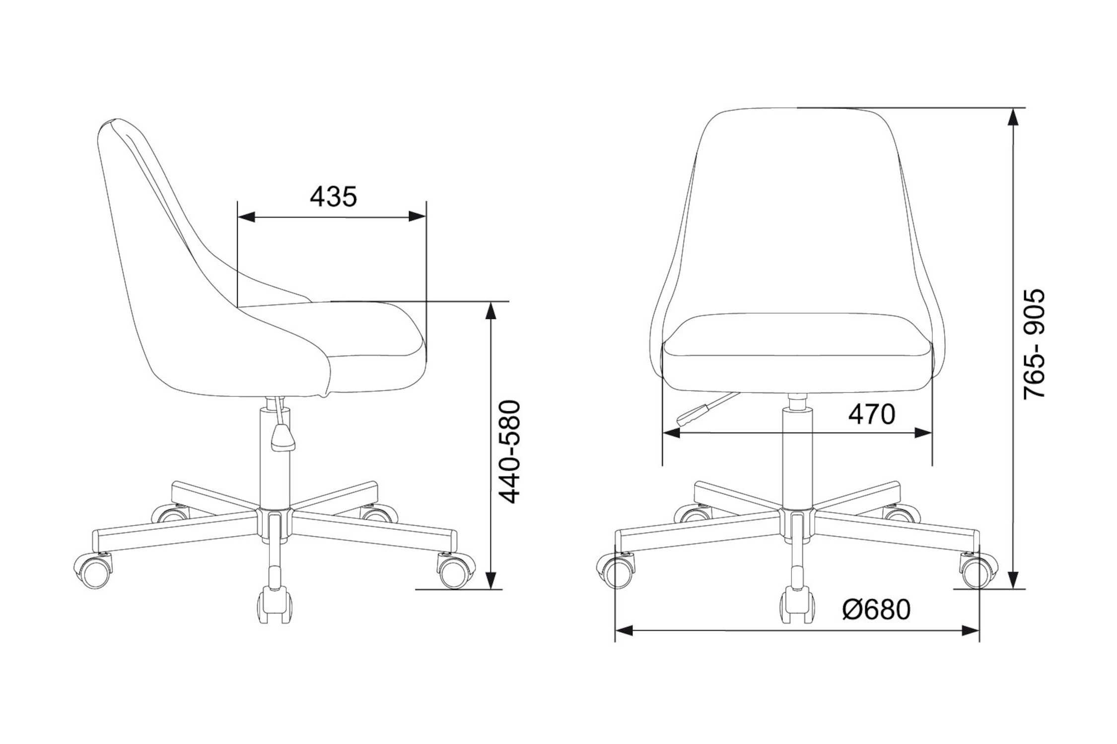 Диаметр колес - 5 см. Высота сиденья - 58 см. Ширина сиденья - 47 см. Глубина сиденья - 43.5 см. Спинка цельная с сиденьем. Материал колес с накладкой PU. Крестовина разборная металлическая.